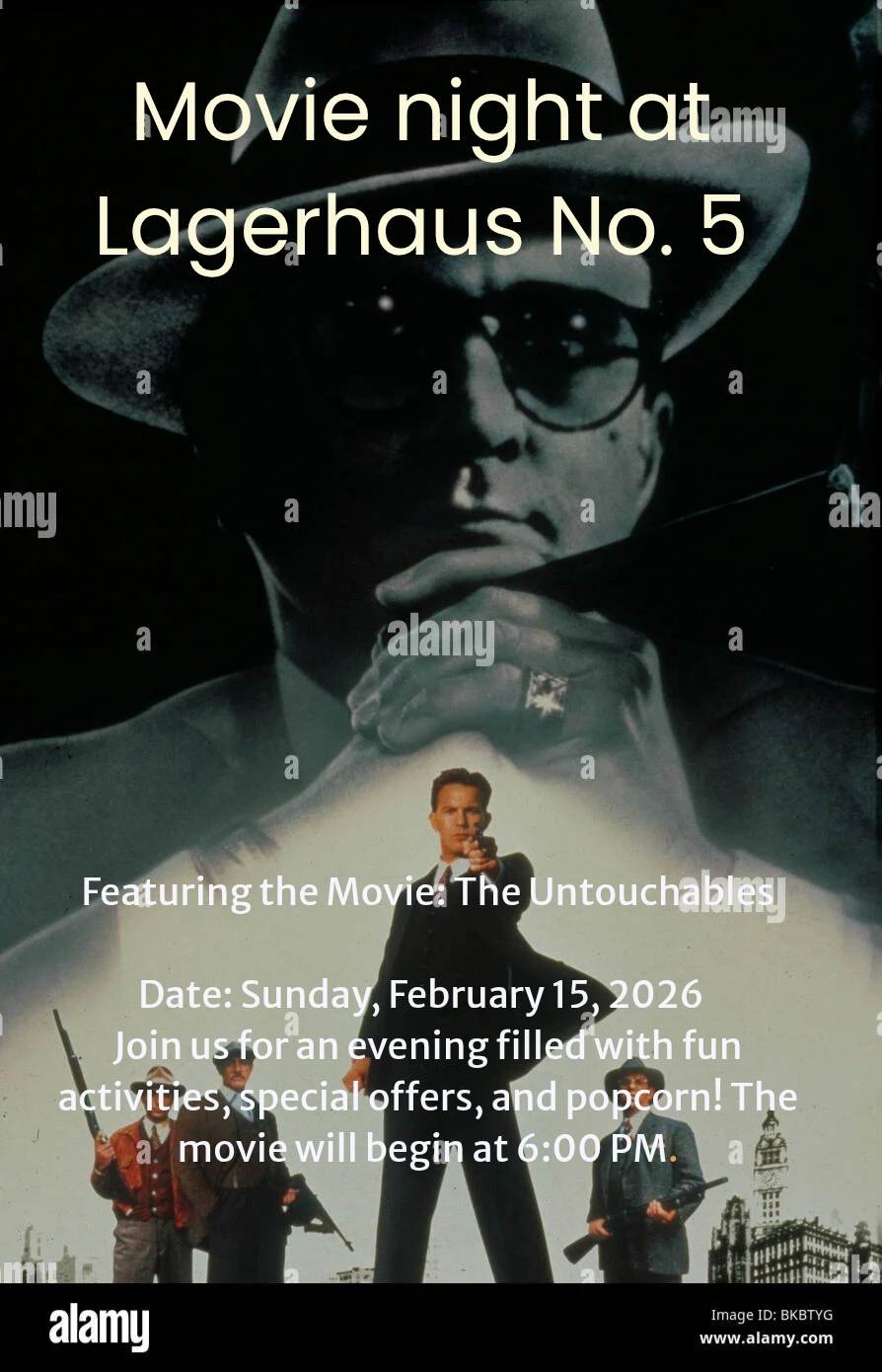 Movie night at Lagerhaus No. 5 Featuring the Movie The Untouchables Date: Sunday, February 15,2026 Join Lagerhaus No. 5 for an evening filled with fun activities, special offers, and popcorn!… Continue reading The Untouchables Movie Night at Lagerhaus No. 5.