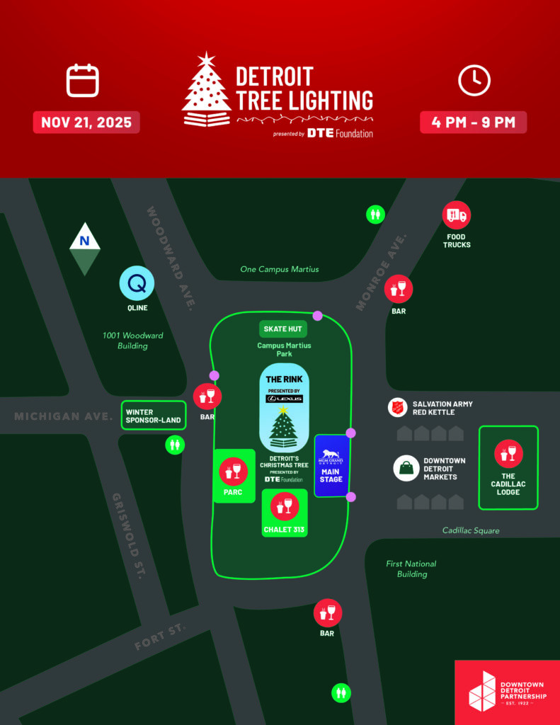 Start your holiday season at the 22nd annual Detroit Tree Lighting on Friday, Nov. 21, at the award-winning Campus Martius Park, presented by DTE Energy Foundation and produced by the Downtown Detroit Partnership. This free celebration brings together music from national and local performers, dazzling figure skating shows, food trucks and unique lighting displays throughout Downtown Detroit. Capture and share your moments on social media using #detroittreelighting2025, #DowntownDet, or #campusmartiuspark.