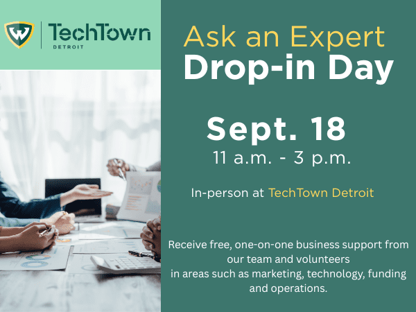 Have questions about your business? Want to meet with one of our subject matter experts in person? Join us for our monthly Ask an Expert Drop-In Day at TechTown! This event will take place Thursday, Sep. 18, from 11 a.m. to 3 p.m.