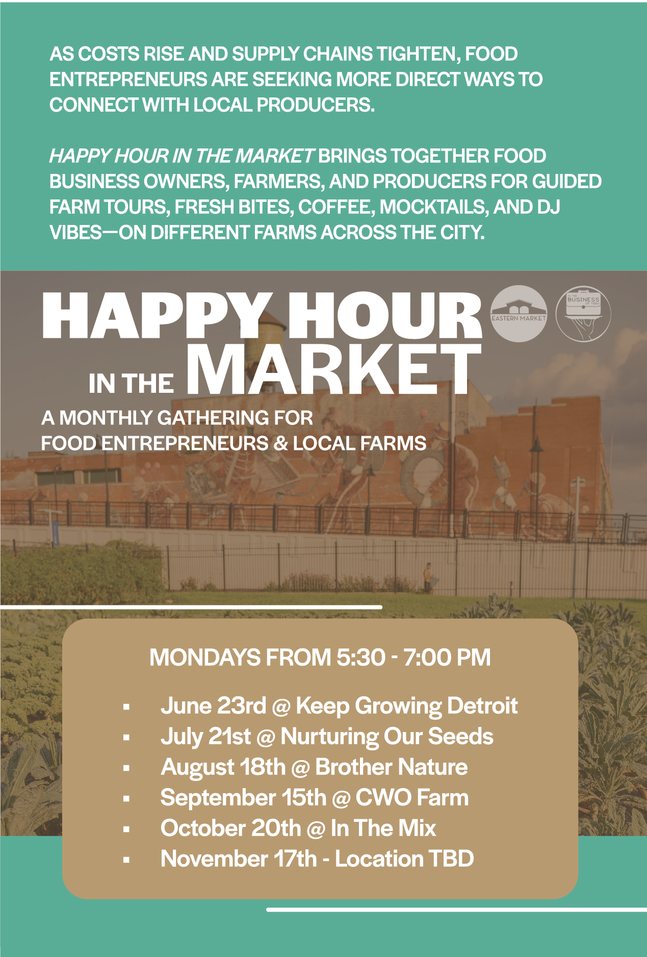 Happy hour in the market brings together food business owners, farmers, and producers for guided farm tours, fresh bites, coffee, mocktails, and DJ vibes-on different farms across the city.