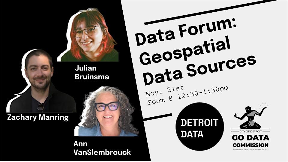 Join us for our Data Forum where we will discuss open data portals and sources of geospatial data.Data Forum: Geospatial Data SourcesWelcome to our Data Forum where we will discuss open data portal and geospatial data sources. We’ll be joined by the Julian Bruinsma from DetroitData.org, Ann VanSlembrouck of SEMCOG, and Zachary Manring from the… Continue reading Detroit Data Forum: Geospatial Data Sources